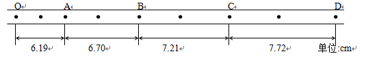 4、填空题 某同学利用打点计时器探究加速度与物体所受合外力及质量的关系,得到了如图所示的一条纸带,根据纸带可求出打下B点时小车的速度大小为 ,小车的加速度大小为 (保留两位有效数字)。