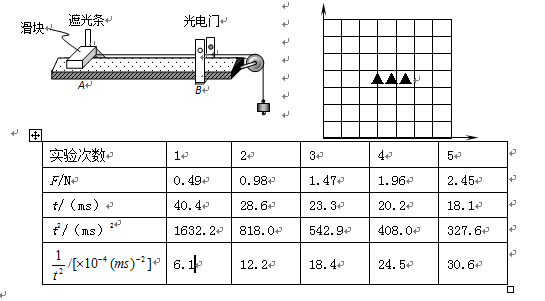 5、实验题 某同学用如图所示装置“研究物体的加速度与外力关系”,他将光电门固定在气垫轨道上的某点B处,调节气垫导轨水平后,用重力为F的钩码,经绕过滑轮的细线拉滑块,每次滑块从同一位置A由静止释放,测出遮光条通过光电门的时间t。改变钩码个数,重复上述实验。记录的数据及相关计算如下表。