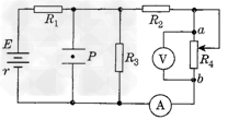 4、选择题  如图所示,平行金属板中带电质点P原处于静止状态,不考虑电流表和电压表对电路的影响,当滑动变阻器R4的滑片向b端移动时,则