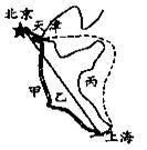 5、选择题 如图所示,三位同学从北京到上海,甲乘火车直达,乙乘飞机直达,丙先乘汽车到天津,再换乘轮船到上海,这三位同学中(? )?