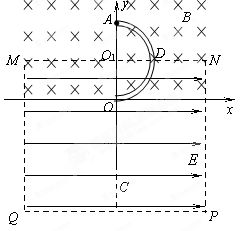 5、计算题 (16分)如图所示,矩形区域MNPQ内有水平向右的匀强电场;在y≥0的区域内还存在垂直于坐标平面向里的匀强磁场,磁感应强度大小为B。半径为R的光滑绝缘空心半圆细管ADO固定在竖直平面内,半圆管的一半处于电场中,圆心O1为MN的中点,直径AO垂直于水平虚线MN。一质量为m、电荷量为q的带正电小球(可视为质点)从半圆管的A点由静止滑入管内,从O点穿出后恰好通过O点正下方的C点。已知重力加速度为g,电场强度的大小
