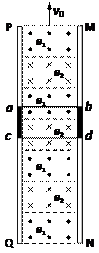 1、计算题 如下图所示,边长为l的正方形金属框abcd套在U型金属框架MNPQ内,两者都放在光滑的水平地板上,U型框架与方形金属框之间接触良好且无摩擦。方形金属框ac、bd边电阻为R,其余两边电阻不计;U型框架NQ边的电阻为R,其余两边电阻不计。虚线右侧空间存在着一个范围足够大的竖直向下的匀强磁场,磁场的磁感强度大小为B。如果将方形金属框固定不动,用力拉动U型框使它以速度v0垂直NQ边向右匀速运动,求: