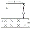 2、简答题 如图所示,一个质量为m,电阻为R的闭合矩形线圈,长为l,高为h,从某一高度由静止开始下落,进入一个有界匀强磁场区域,磁场方向垂直纸面向里,磁感应强度大小为B,磁场的边界为水平,宽度为2h,线圈开始下落时距磁场上边界3h,下落过程中始终在竖直平面内,不发生转动.已知线圈从磁场中穿出的过程中,做的是匀速运动.求线圈在进入磁场的过程中有多少电能转化为内能?