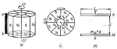 1、计算题  (11分)某同学根据电磁感应现象设计了一种发电装置,如图甲所示,图乙为其俯视图.将8块相同磁铁的N、S极交错放置组合成一个高h = 0.5 m、半径r = 0.2 m的圆柱体,其可绕固定的OO" 轴转动.圆柱外侧附近每个磁场区域的磁感应强度大小均为B = 0.2T,方向都垂直于圆柱表面,相邻两个