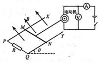 3、计算题  如图,电阻不计的足够长的平行光滑金属导轨PX、QY相距L=0.5m,底端连接电阻R=2Ω,导轨平面倾斜角θ=30°,匀强磁场垂直于导轨平面向上,磁感应强度B=1T。质量m=40g、电阻R=0.5Ω的金属棒MN放在导轨上,金属棒通过绝缘细线在电动机牵引下从静止开始运动,经过时间t1=2s通过距离x=1.5m,速度达到最大,这个过程中电压表示数U0=8.0V,电流表实数I0=0.6A,示数稳定,运动过程中金属棒始终与导轨垂直,细线始终与导轨平行且在同一平面内,电动机线圈内阻r0=0.5Ω,g=10m/s2.。求: