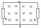 1、填空题  如图所示,在磁感应强度B为0.4T的匀强磁场中,让长为0.2m的导体ab在金属框上以6m/s的速度向右移动,此时ab中感应电动势的大小等于______________V,如果R1=6Ω,R2=3Ω,其它部分的电阻不计,则通过ab的电流大小为______________A。