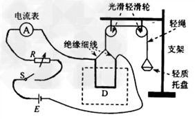 1、实验题 图中虚线框内存在一沿水平方向、且与纸面垂直的匀强磁场。现通过测量通电导线在磁场中所受的安培力,来测量磁场的磁感应强度大小、并判定其方向。所用部分器材已在图中给出,其中D为位于纸面内的U形金属框,其底边水平,两侧边竖直且等长;E为直流电源;R为电阻箱;A为电流表;S为开关。此外还有细沙、天平、米尺和若干轻质导线。