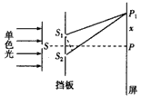 4、选择题 如图所示是双缝干涉实验装置,使用波长为600 nm的橙色光源照射单缝S,在光屏中央P处观察到亮条纹,P点上方的P1点处于第一级亮纹中心(即P1到S1、S2的光程差为一个波长),现换用波长为400 nm的紫光源照射单缝,则
