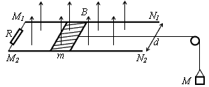 3、计算题 如图所示,M1N1、M2N2是两根处于同一水平面内的平行导轨,导轨间距离是d=0.5m,导轨左端接有定值电阻R=2Ω,质量为m=0.1kg的滑块垂直于导轨,可在导轨上左右滑动并与导轨有良好的接触,滑动过程中滑块与导轨间的摩擦力恒为f=1N,滑块用绝缘细线与质量为M=0.2kg的重物连接,细线跨过光滑的定滑轮,整个装置放在竖直向上的匀强磁场中,磁场的磁感应强度是B=2T,将滑块由静止释放。设导轨足够长,磁场足够大,M未落地,且不计导轨和滑块的电阻。g=10m/s2,求: