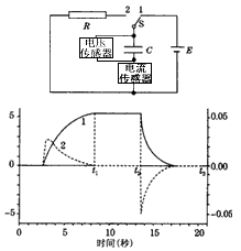 5、填空题 如图为研究电容器充、放电的电路图,电源直流6 V左右,电容用10 000 μF的电解电容,先将开关S与“1”端相连,电源向电容器充电,然后把开关S掷向“2”端,电容器通过电阻R放电,将传感器测得的电流、电压信息传入计算机,屏幕上显示出电流和电压随时间变化的图线为下图中的“1” 和“2”,其中图线__________(填“1”或“2”)为电流随时间变化的图线;__________时刻(填“t1”“t2”或“t3”)为电容器开始放电的时刻。