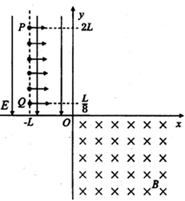 1、计算题  (18分)如图所示,在直角坐标系xOy的第Ⅱ象限整个区域内,存在着沿y轴负方向、场强大小为E的匀强电场,在第Ⅳ象限整个区域内存在着方向垂直于xOy平面向里、磁感应强度大小为B的匀强磁场。从电场中P(-L,2L)、Q(-L, )两点连线上各处,沿x轴正方向同时射入许多质量为m、电荷量为q的带正电粒子,结果所有粒子都从坐标原点O进入磁场。不计粒子的重力及粒子之间的相互作用,求: