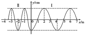 1、选择题  图中y轴是两种不同介质Ⅰ、Ⅱ的分界面,一波源以坐标系原点为中心沿y轴上下振动,形成的两列简谐波分别沿+x轴和-x轴方向传播,某一时刻的波形如图所示。在介质Ⅰ、Ⅱ中传播的波