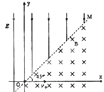 3、计算题 (17分)如图所示,在xoy平面上,直线OM与x轴正方向夹角为45o,直线OM左侧存在平行y轴的匀强电场,方向沿y轴负方向。直线OM右侧存在垂直xoy平面向里的磁感应强度为B的匀强磁场。一带电量为q,质量为m带正电的粒子(忽略重力)从原点O沿x轴正方向以速度vo射入磁场。此后,粒子穿过磁场与电场的边界三次,恰好从电场中回到原点O。(粒子通过边界时,其运动不受边界的影响)