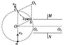 (3)当t=时,粒子以速度v0沿O2O1射入电场,该粒子恰好从M板边缘以平行于极板的速度射入磁场,进入磁场的速度仍为v0,运动的轨迹半径为R。设进入磁场时的点为b,离开磁场时的点为c,圆心为O3,如图所示,四边形ObO3c是菱形,所以Oc∥O3b,故c、O、a三点共线,ca即为圆的直径,则c、a间的距离d=2R