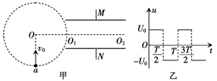 2、计算题 如图甲所示,在真空中,有一半径为R的圆形区域内存在匀强磁场,磁场方向垂直纸面向外。在磁场右侧有一对平行金属板M和N,两板间距为R,板长为2R,板间的中心线O1O2与磁场的圆心O在同一直线上。有一电荷量为q、质量为m的带正电的粒子以速度v0从圆周上的a点沿垂直于半径OO1并指向圆心O的方向进入磁场,当从圆周上的O1点水平飞出磁场时,给M、N两板加上如图乙所示的电压,最后粒子刚好以平行于N板的速度从N板的边缘飞出。(不计粒子所受到的重力、两板正对面之间为匀强电场,边缘电场不计),求: