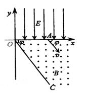 5、计算题 如图所示,在xOy平面的第一象限有一匀强电场,电场强度大小未知,电场的方向平行于y轴向下;在x轴和第四象限的射线OC之间有一匀强磁场,磁感应强度的方向垂直于纸面向外。有一质量为m,带有电荷量+q的质点由电场左侧平行于x轴射入电场。质点到达x轴上A点时,速度大小为v,速度方向与x轴的夹角,A点与原点O的距离为d。接着质点进入磁场,并垂直于磁场边界的OC射线飞离磁场。不计重力影响。若OC与x轴的夹角为