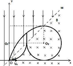 3、计算题 (17分)如图所示,在xoy平面上,直线OM与x轴正方向夹角为45o,直线OM左侧存在平行y轴的匀强电场,方向沿y轴负方向。直线OM右侧存在垂直xoy平面向里的磁感应强度为B的匀强磁场。一带电量为q,质量为m带正电的粒子(忽略重力)从原点O沿x轴正方向以速度vo射入磁场。此后,粒子穿过磁场与电场的边界三次,恰好从电场中回到原点O。(粒子通过边界时,其运动不受边界的影响)