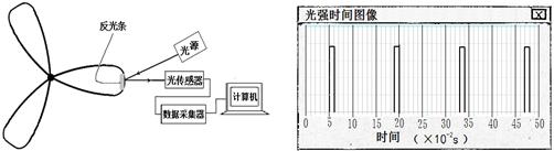 5、实验题 某同学想利用DIS测电风扇的转速和叶片长度,他设计的实验装置如左下图所示.他先在某一叶片边缘粘上一小条弧长为△l的反光材料,当该叶片转到某一位置时,用光传感器接收反光材料反射的激光束,并在计算机屏幕上显示出矩形波,如右下图所示,屏幕横向每大格表示的时间为5.00×10-2s.则矩形波的“宽度”所表示的物理意义是______;电风扇的转速为_____转/s;若△l为10cm,则叶片长度为_____m.