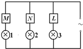 5、选择题 如图所示,在电路两端加上正弦交流电,保持电压最大值不变,使频率减小,发现各灯的亮暗情况是:灯1变亮,灯2变暗,灯3不变,则M、N、L中所接元件可能是( )