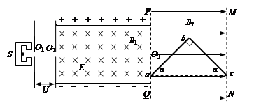 1、计算题 (16分)如图所示,S粒子源能够产生大量的质量为m、电荷量为+q的粒子(重力不计)。粒子从O1孔进入一个水平方向的加速电场(初速不计),再经小孔O2进入相互正交的匀强电场和匀强磁场区域,电场强度大小为E,磁感应强度大小为B1,方向如图。虚线PQ、MN之间存在着水平向右的匀强磁场,磁场范围足够大,磁感应强度大小为B2。一块折成直角的硬质塑料片abc(不带电,宽度、厚度都很小可以忽略不计)放置在PQ、MN之间,截面图如图,a、c两点分别位于PQ、MN上,ab=bc=L,α= 45?。粒子能沿图中虚线O2O3的延长线进入PQ、MN之间的区域。
