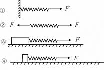 4、选择题 如图所示,四个完全相同的弹簧都处于水平位置,它们的右端受到大小皆为F的拉力作用,而左端的情况各不相同:①弹簧的左端固定在墙上;②弹簧的左端受大小也为F的拉力作用;③弹簧的左端拴一小物块,物块在光滑的桌面上滑动;④弹簧的左端拴一小物块,物块在有摩擦的桌面上滑动。若认为弹簧质量都为零,以.