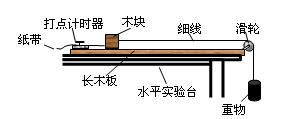 1、实验题 某实验小组想测量木板对木块的摩擦力所做的功.装置如图,一木块放在粗糙的水平长木板上,右侧栓有一细线,跨过固定在木板边缘的滑轮与重物连接,木块左侧与穿过打点计时器的纸带相连,长木板固定在水平实验台上.实验时,木块在重物牵引下向右运动,重物落地后,木块继续向右做匀减速运动,下图给出了重物落地后打点计时器打出的纸带,系列小黑点是计数点,每相邻两计数点间还有4个点(图中未标出 ),计数点间的距离如图所示.打点计时器所用交流电频率为50Hz,不计纸带与木块间的拉力.