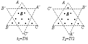 t1=T/6时刻和t2=T/2时刻线圈的位置分别如下面的两图所示.不难看出,与初始时刻相比,两种情况的磁通量变化量相等,都是三个边长为a/3的正三角形内的磁通量,等于ΔΦ=B?