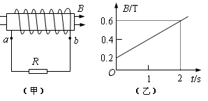 4、填空题 如图(甲)所示螺线管的匝数n =1500,横截面积S =20cm2,电阻r =2Ω,与螺线管串联的外电阻R =4Ω。若穿过螺线管的匀强磁场的磁感应强度按图(乙)所示的规律变化,则线圈两端a、b之间的电压为_____________V,电阻R上消耗的电功率______________W。