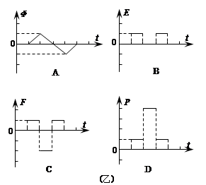1、选择题 如图(甲)所示,为两个有界匀强磁场,磁感应强度大小均为B,方向分别垂直纸面向里和向外,磁场宽度均为L,距磁场区域的左侧L处,有一边长为L的正方形导体线框,总电阻为R,且线框平面与磁场方向垂直,现用外力F使线框以速度v匀速穿过磁场区域,以初始位置为计时起点,规定电流沿逆时针方向时的电动势E为正,磁感线垂直纸面向里时磁通量Φ的方向为正,外力F向右为正。则图(乙)中关于线框中的磁通量Φ、感应电动势E、外力F和电功率P随时间t变化正确的是?(?)
