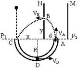 本题解析:(1)如图,设绝缘轨道半径为R,A到板N的距离为d,AB的竖直距离为y,C到板N的距离为x;到达最低点D的速度为vD,到A点时的速度为vA,到达孔B时的速度为vB。