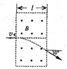 5、计算题 (4分)如图所示,矩形区域宽度为l,其内有磁感应强度为B、垂直纸面向外的匀强磁场.一带电粒子以初速度v0垂直左边界射入,飞出磁场时偏离原方向300.若撤去原来的磁场,在此区域内加一个电场强度为E、方向竖直向下的匀强电场(图中未画出),带电粒子仍以原来的初速度入射.不计粒子的重力,求: