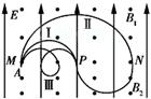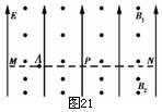 2、简答题 如图21所示,水平直线MN为两个匀强磁场的分界面,MN上方的磁感应强度B1=B,MN下方的磁感应强度B2=2B,磁场方向均垂直纸面向外.在磁场的空间还存在匀强电场,电场强度大小为E,竖直向上.一带电小球从界面上的A点沿电场方向射入上部磁场区域后恰能在竖直方向上做匀速圆周运动.在A点的右侧的界面上有一点P,与A点的距离为d.要使小球能经过P点,则小球从A点射出的速度v应满足什么条件?