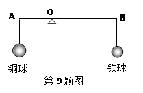 5、选择题 如图所示,AB为一轻质杠杆,O为支点,BO=2AO,AB两端分别悬挂实心铜球和实心铁球,杠杆在水平位置平衡,若将两球同时浸没在某液体中,液体的密度小于铜和铁的密度,则