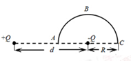 5、选择题  对于真空中电荷量为q的静止点电荷而言,当选取离点电荷无穷远处的电势为零时,离点电荷距离为r处的电势为φ=kq/r(k为静电力常量),如图所示,两电荷量大小均为Q的异种点电荷相距为d,现将一质子(电荷量为e)从两电荷连线上的A点沿以负电荷为圆心、半径为R的半圆形轨迹ABC移到C点,在质子从A到C的过程中,系统电势能的变化情况为(    )