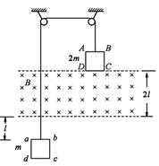 3、计算题 如图所示,竖直面内的正方形导线框ABCD、abcd的边长均为l、总电阻均为R,质量分别为2m和m,它们分别系在一跨过两个定滑轮的轻绳两端,在两导线框之间有一宽度为2l、磁感应强度大小为B、方向垂直竖直面向里的匀强磁场. 开始时ABCD的下边与匀强磁场的上边界重合,abcd的上边到匀强磁场的下边界的距离为l. 现将系统由静止释放,当ABCD刚全部进入磁场时,系统开始做匀速运动. 不计摩擦和空气阻力,求: