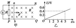 1、计算题 (11分)如图甲所示,光滑且足够长的金属导轨MN、PQ平行地固定在同一水平面上,两导轨间距L=0.20 m,两导轨的左端之间所接的电阻R=0.40 Ω,导轨上静止放置一质量m=0.10 kg的金属杆ab,位于两导轨之间的金属杆的电阻r=0.10 Ω,导轨的电阻可忽略不计.整个装置处于磁感应强度B=0.50 T的匀强磁场中,磁场方向竖直向下.现用一水平外力F水平向右拉金属杆,使之由静止开始运动,在整个运动过程中金属杆始终与导轨垂直并接触良好,若理想电压表的示数U随时间t变化的关系如图乙所示,求从金属杆开始运动经t=5.0 s时: