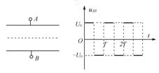 5、选择题 一对平行金属板长为L,两板间距为d,质量为m,电荷量为e的电子从平行板左侧以速度v0沿两板的中线不断进入平行板之间,两板间所加交变电压uAB如图所示,交变电压的周期