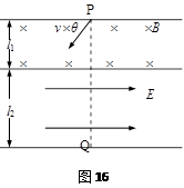 的两个相邻的条形区域中分别有匀强磁场和匀强电场,磁场方向垂直于纸面向里,电场方向与电、磁场分界线平行向右。一带正电的粒子以速率v从磁场区域的上边界的P点向下成θ=60?射入磁场,然后以垂直于电、磁场分界线的方向进入电场,最后从电场边界上的Q点射出。已知PQ垂直于电场方向,不计重力。求电场强度和磁感应强度大小之比,以及粒子在磁场与电场中运动的时间之比。