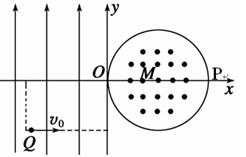 2、计算题 (12分)如图所示,在平面直角坐标系xOy内,第二、三象限内存在沿y轴正方向的匀强电场,第一、四象限内存在半径为L的圆形匀强磁场,磁场方向垂直于坐标平面向外。一个比荷()为K的带正电的粒子从第三象限中的Q(-2L,-L)点以速度v0沿x轴正方向射出,恰好从坐标原点O进入磁场,从P(2L,0)点射出磁场。不计粒子重力,求: