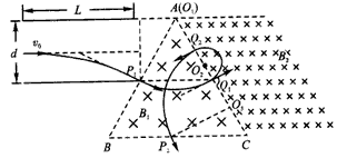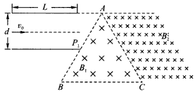 的电压,上金属板电势高;现从左端沿中心轴线方向入射一个重力不计的带电微粒,微粒质量m=10-10 kg,带电量q=+10-4 C,初速度v0=105m/s;中间用虚线框表示的正三角形内存在垂直纸面向里的匀强磁场B1,三角形的上顶点A与上金属板平齐,AB边的中点P1恰好在下金属板的右端点;三角形区域的右侧也存在垂直纸面向里,范围足够大的匀强磁场B2,且B2=4B1;求