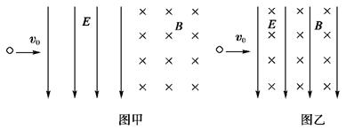 4、选择题 (2010·湖南省师大附中月考)一带电粒子以初速度v0沿垂直于电场线和磁感线的方向,先后穿过宽度相同且紧邻在一起的有明显边界的匀强电场(场强为E)和匀强磁场(磁感应强度为B),如图甲所示.电场和磁场对粒子做功为W1,粒子穿出磁场时的速度为v1;若把电场和磁场正交叠加,如图乙所示,该粒子仍以初速度v0穿过叠加场区,电场和磁场对粒子做功为W2,粒子穿出场区时的速度为v2,比较W1和W2、v1和v2的大小(v0<E/B,不计重力)?? ( )