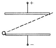 5、选择题 如图所示,水平放置的平行金属板充电后板间形成匀强电场,板间距离为d,一个带负电的液滴带电量大小为q,质量为m,从下板边缘射入电场,沿直线从上板边缘射出,则