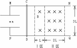 3、计算题 如图所示,水平金属导轨MN、PQ固定于同一竖直平面上,高度差为3L,左端与水平放置的平行极板相连接,长方形区域Ⅰ、区域Ⅱ存在垂直导轨平面的匀强磁场,两磁场区域的宽度分别为L、2L,Ⅱ区磁感应强度大小是Ⅰ区的3倍. 金属杆CD在外力作用下能保持竖直状态,紧贴导轨匀速滑行,且与导轨接触良好. 当CD杆以2v0的速度水平向右进入Ⅰ区的磁场时,两极板中有一质量为m的带电油滴恰能平衡. 现让CD杆以v0的速度匀速通过两个磁场区域,杆刚进入Ⅰ区的磁场时,释放油滴,如果只考虑CD杆在两磁场区的过程,设油滴不会落到极板上,重力加速度为g. 求全过程: