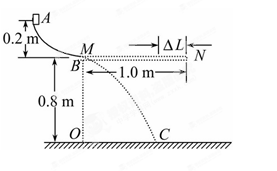 1、计算题 如图所示,在竖直平面内有半径为R="0.2" m的光滑1/4圆弧AB,圆弧B处的切线水平,O点在B点的正下方,B点高度为h="0.8" m。在B端接一长为L="1.0" m的木板MN。一质量为m="1.0" kg的滑块,与木板间的动摩擦因数为0.2,滑块以某一速度从N点滑到板上,恰好运动到A点。 (g取10 m/s2)求: