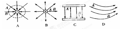 1、选择题  如图所示各电场中,  A、B两点场强相同的是