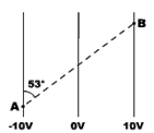 3、填空题  如图所示,匀强电场中有三个等势面中,电势分别为?10V、0V、10V,A、B两点间相距2.5cm,A、B连线与等势面的夹角为53°,则该匀强电场的场强大小为______________,方向 ?。?