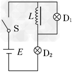5、选择题 如图所示,E为电池,L是电阻可忽略不计、自感系数足够大的线圈,D1、D2是两个规格相同且额定电压足够大的灯泡,S是控制电路的开关。这个电路,下列说法中正确的是