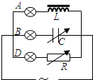 1、选择题 如图所示,当交流电源电压恒为220V,频率为100Hz时,三只灯泡A、B、D的亮度相同,若只将交流电的频率改为50Hz,则( )