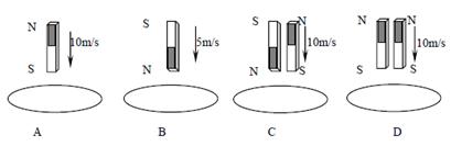4、选择题 下列各图中的各条形磁铁均相同,当条形磁铁以图示方式穿过相同的线圈时,线圈中产生的感应电动势最大的是