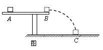 4、计算题 (12分)如图所示,质量为2.0kg的木块放在水平桌面上的A点,受到一瞬时冲量后以某一速度在桌面上沿直线向右运动,运动到桌边B点后水平滑出落在水平地面C点。已知木块与桌面间的动摩擦因数为0.20,桌面距离水平地面的高度为1.25m,A、B两点的距离为4.0m, B、C两点间的水平距离为1.5m,g=10m/s2。不计空气阻力,求: